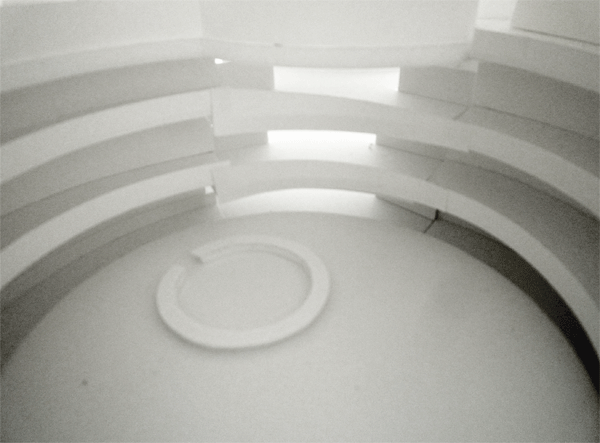 富士山というもっとも強力なアイコンの一つをテーマとする施設には強いテーマ性が必要と考え、この施設は、富士山についての博物館であると同時に、日本人にとっての富士山とは何かという問いを空間体験のテーマとして表現した。究極的には日本について理解したければ、この施設に行けと言われるような施設になることを目指した。 建物構成は建物の中心に二つのヴォイドがあり、その周辺に二つのヴォイドを八の字型にめぐるらせん状の通路的空間があり、それらの上に方形の箱が外装として重ねあわされている。 上写真 模型写真(屋根無の状態) |